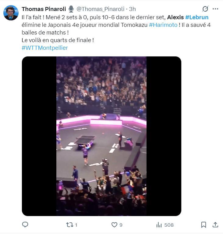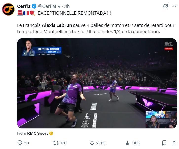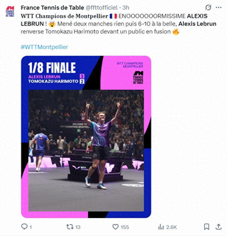 WTT蒙彼利埃冠軍賽男單1/8決賽,本土作戰的艾利克斯-勒布倫3-2逆轉擊敗了日本選手張本智和,這一戰蕩氣迴腸,22歲的大勒布倫戰勝了同齡人的佼佼者張本智和,因爲張本智和的世界排名第四,法國媒體們都陷入了瘋狂狀態。