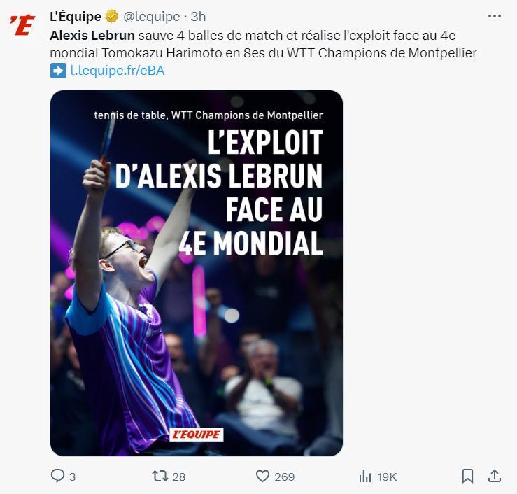 法媒:大勒挽救4個賽點,並在蒙彼利埃冠軍賽1/8決賽淘汰了世界排名第四的張本智和實現這一壯舉。