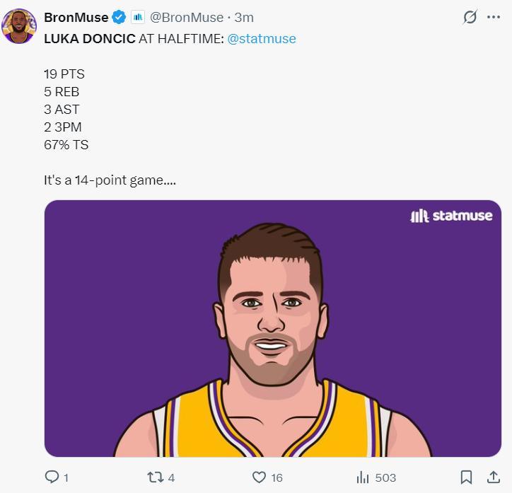 第二節東契奇賠上兩個犯規,而且湖人的防守稀爛,單節讓灰熊轟下42分,東契奇單節只拿6分,灰熊的奔跑戰術拖垮湖人,東契奇半場19分5籃板3助攻,真實命中率67%完全不夠。