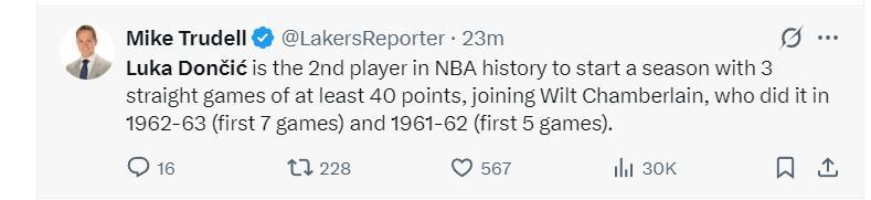 湖人記者:東契奇是聯盟歷史第二位開賽連續三場比賽都拿到40+的球員與張伯倫並列,張伯倫曾在1962-63賽季與1961-62賽季完成過。