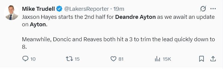 湖人隊記邁克-特魯戴爾:下半場艾頓沒有先發也沒有在替補席,正在等待官方消息。