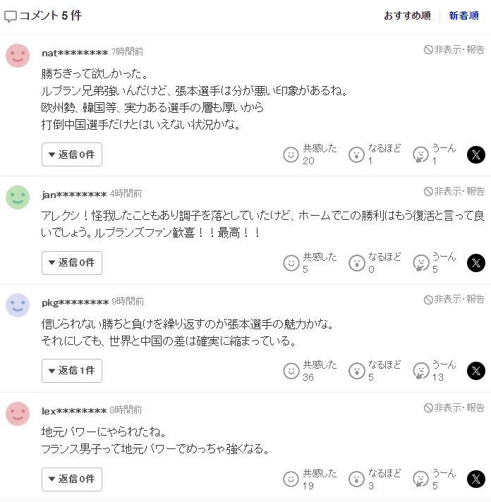 日本球迷們這一次也沒有炮轟張本,這位球迷寫道:決勝局10-6領先都輸了,看起來主辦方的優勢巨大,在蒙彼利埃有主場加成。