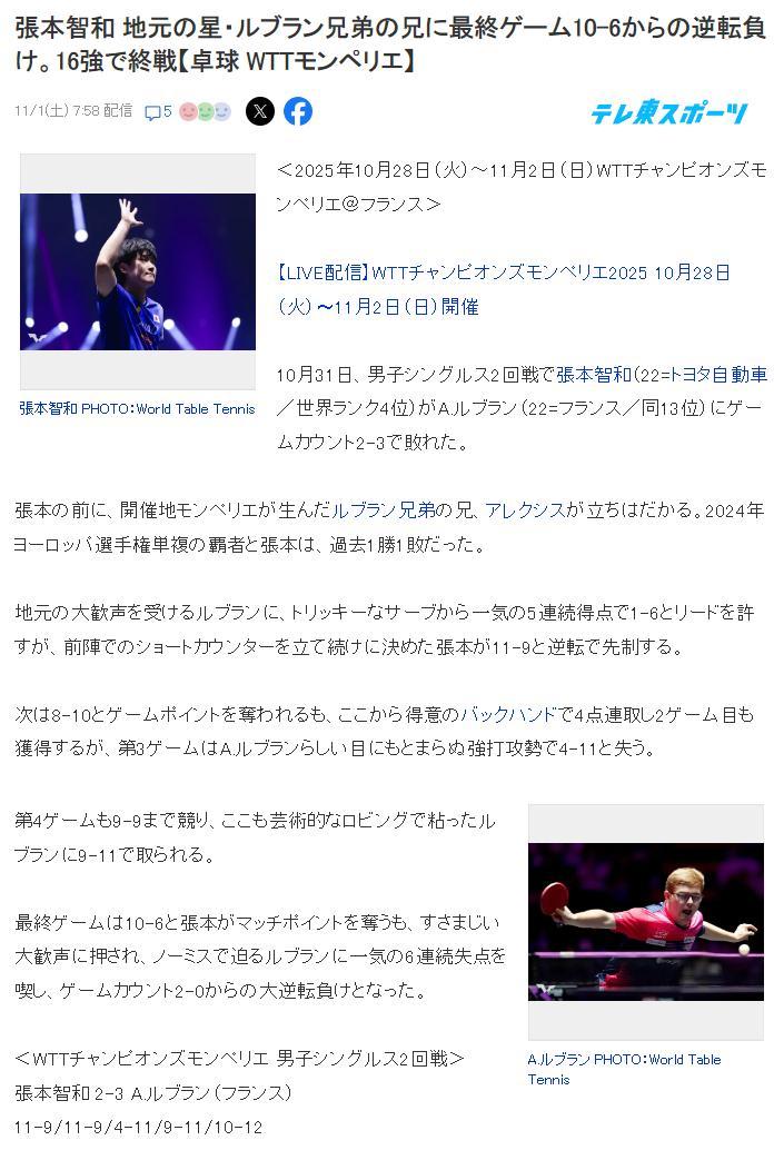 原本以爲日媒《東京體育新聞》會痛批張本智和,沒想到日媒的標題只是:決勝局10-6被逆轉,張本智和輸給了當地球星艾利克斯-勒布倫止步蒙彼利埃男單16強。