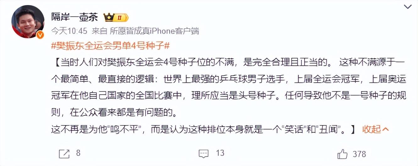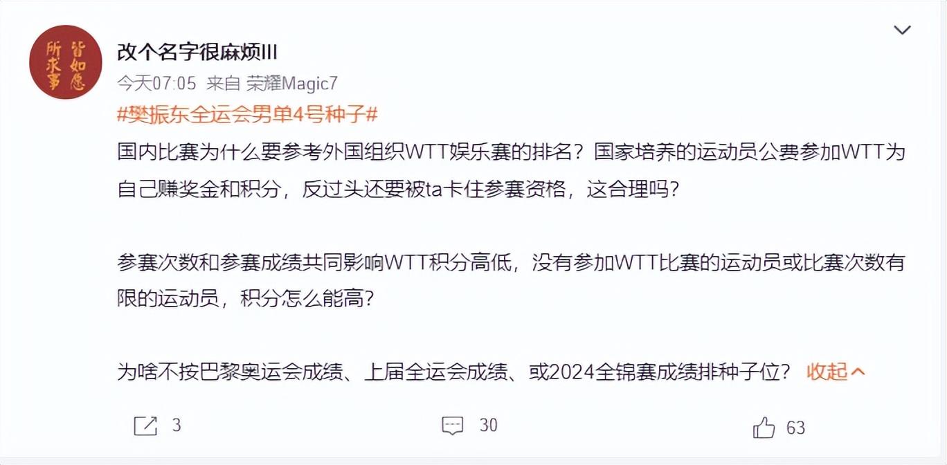 還有球迷直言國內比賽爲什麼要參考外國組織WTT的商業積分排名,爲何不參考巴黎奧運會、上屆全運會、2024年全錦賽的成績來排名?【那樣算樊振東都該是頭號種子】