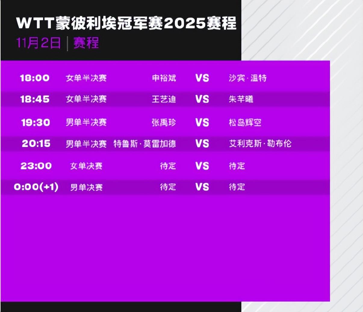 半決賽的賽程也已經出爐,申裕斌VS溫特、王藝迪VS朱芊曦、張禹珍VS松島輝空、莫雷加德VS大勒;