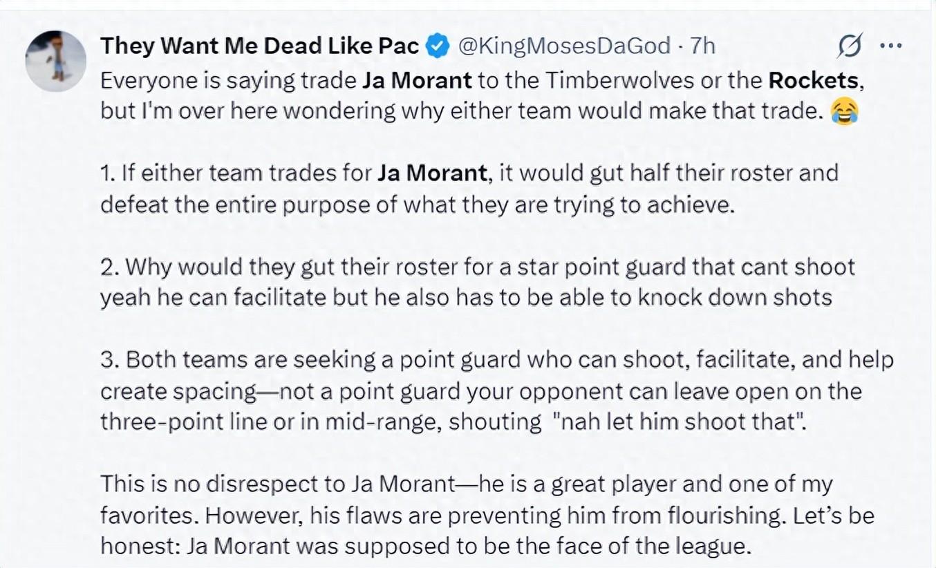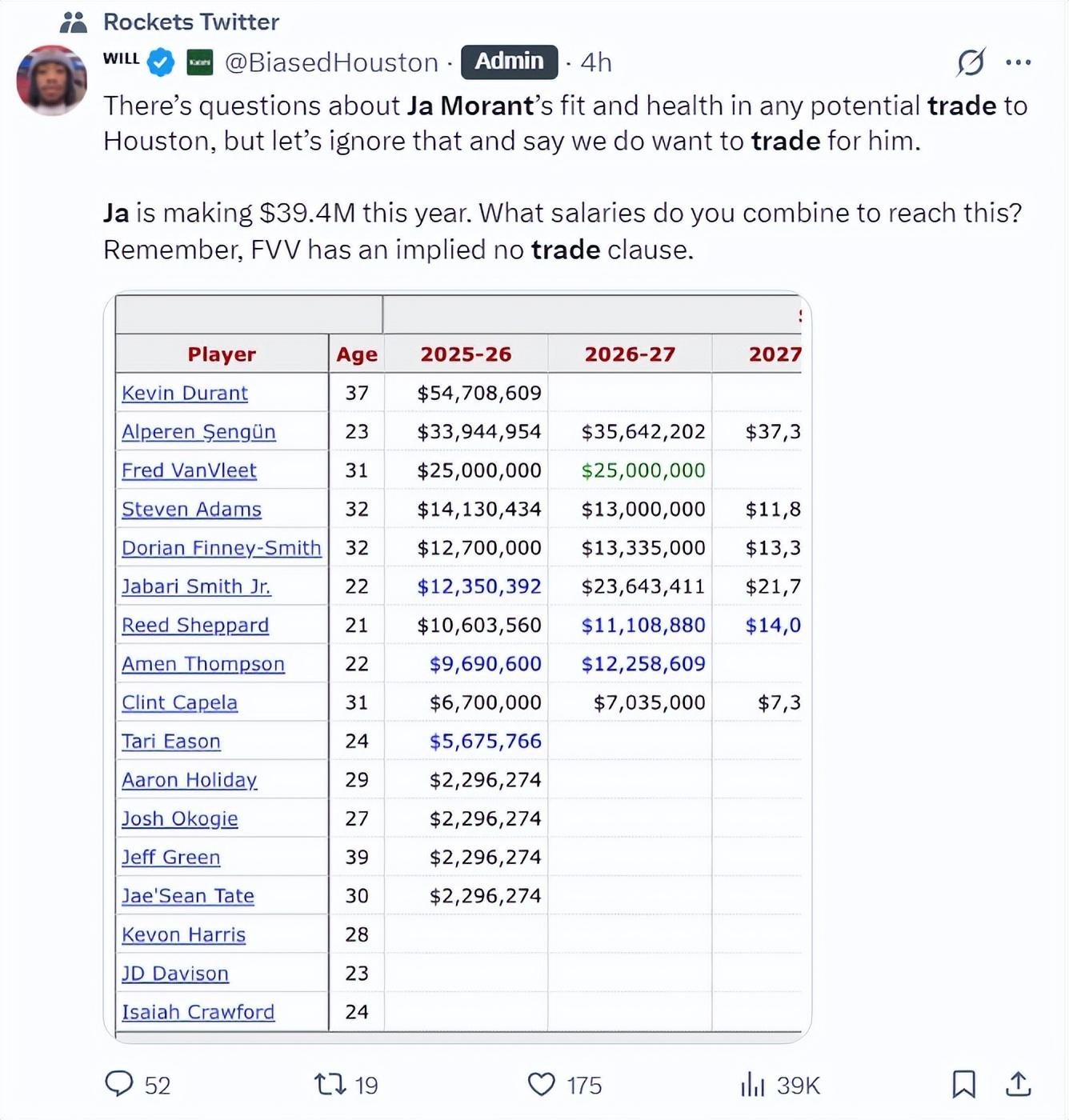 休媒Biased Houston爲大家解答了不可操作性:大家都在討論莫蘭特是否適合火箭隊體系時,我想告訴大家這筆交易存在一些疑問,莫蘭特今年合同3940萬,要配平這樣的薪金空間我們送出誰呢?要知道範弗利特的合同中隱藏了不可交易條款。