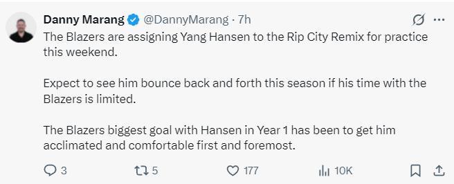 開拓者另一記者Danny Marang透露了楊瀚森新的培養計劃,如果楊瀚森在開拓者無法獲得輪換時間,那麼預計楊瀚森會在本賽季頻繁的往返混音隊與開拓者隊,開拓者首個賽季的目標是讓楊瀚森儘快適應、融入球隊,而且要讓楊瀚森感到自在舒適。