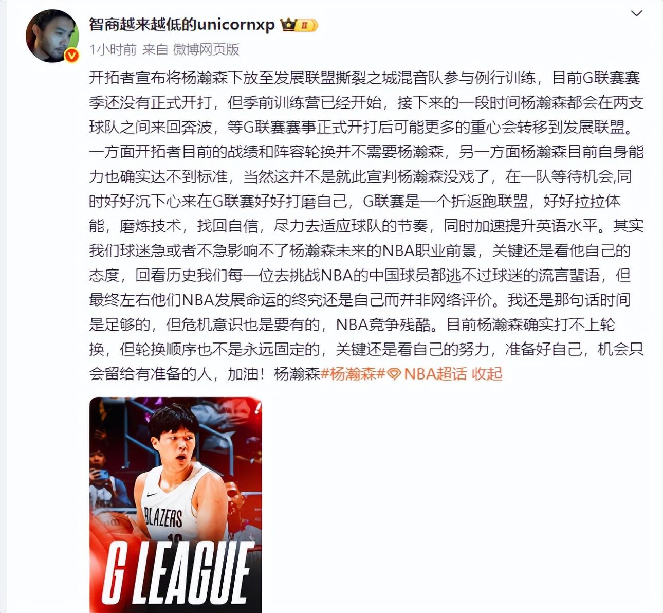 歐洲籃球專家王健表示:接下來一段時間楊瀚森會在混音、開拓者兩隊之間奔波,等G聯賽開賽後他重心應該會轉移到發展聯盟,一方面開拓者戰績、陣容輪換不需要楊瀚森,另一方面楊瀚森自己能力不足。