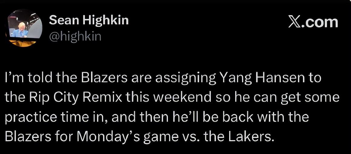 根據開拓者記者Sean Highkin的報道,楊瀚森在被下放發展聯盟後會在混音隊訓練,在開拓者11月4日主場對陣湖人的比賽中再度將楊瀚森召回。
