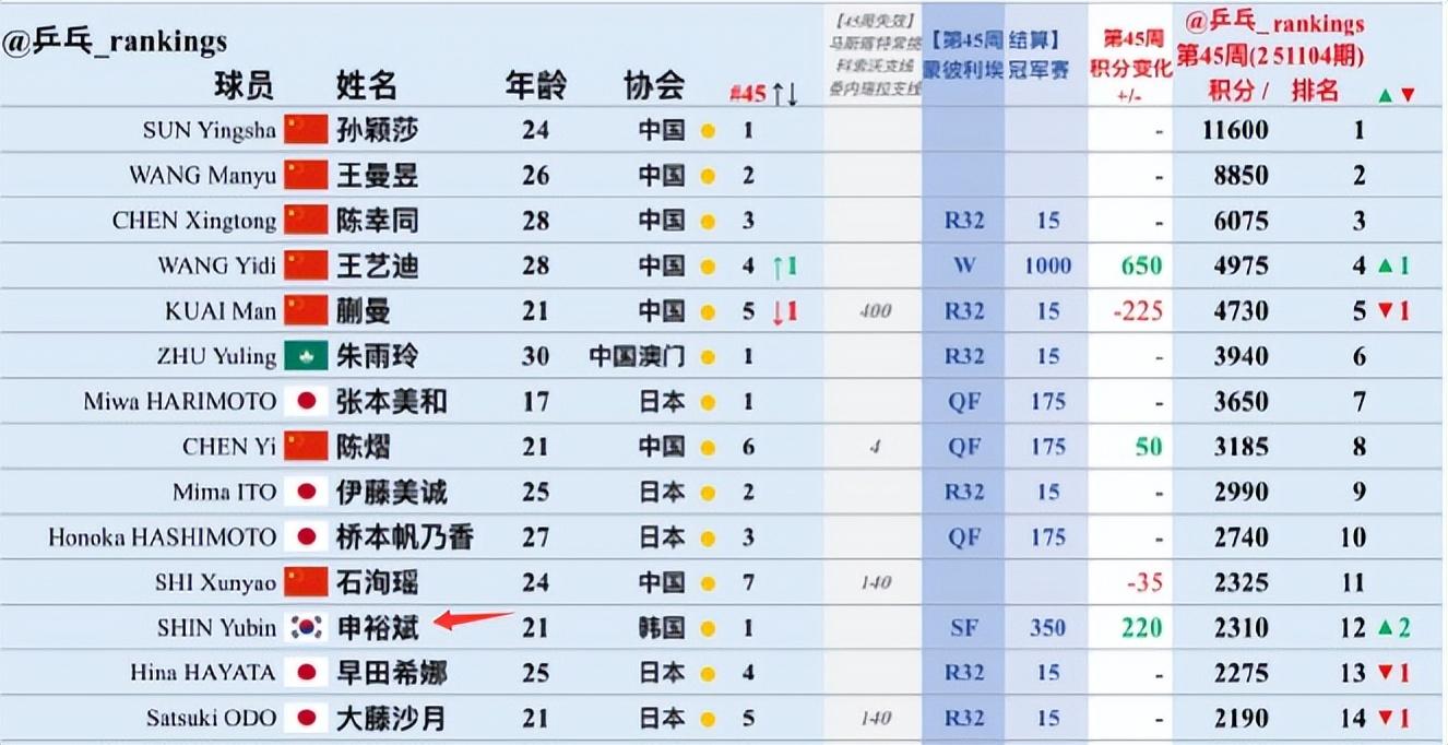 除此之外她法國站進入四強拿到了350積分,算上失效的三站積分她+220,她的總積分來到2310分,她超過了大藤沙月、早田希娜成爲世界排名第12。