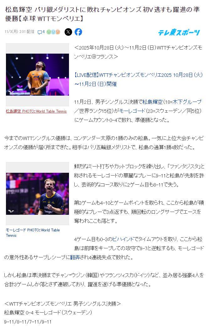 2025年WTT蒙彼利埃冠軍賽男單決賽,松島輝空0-4慘敗莫雷加德無緣奪冠,四局比分:9-11、8-11、7-11、9-11。在輸掉比賽後18歲的日乒小將松島輝空是仰天長嘆,他又一次跟WTT1000+賽事的冠軍擦肩而過。
