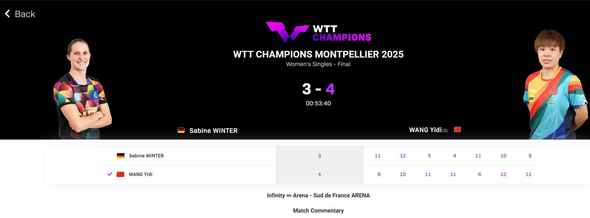 這場比賽王藝迪也贏得非常不容易,不知道是不是蒙彼利埃對歐洲選手均有加成,溫特這場決賽打得感覺比打申裕斌時還要興奮,她開場就2-0大比分領先王藝迪,隨後王藝迪扳成2-2,天王山又被溫特拿下,溫特是3-2大比分領先王藝迪,但大迪的抗壓能力很強,大迪最終完成了4-3大逆轉。