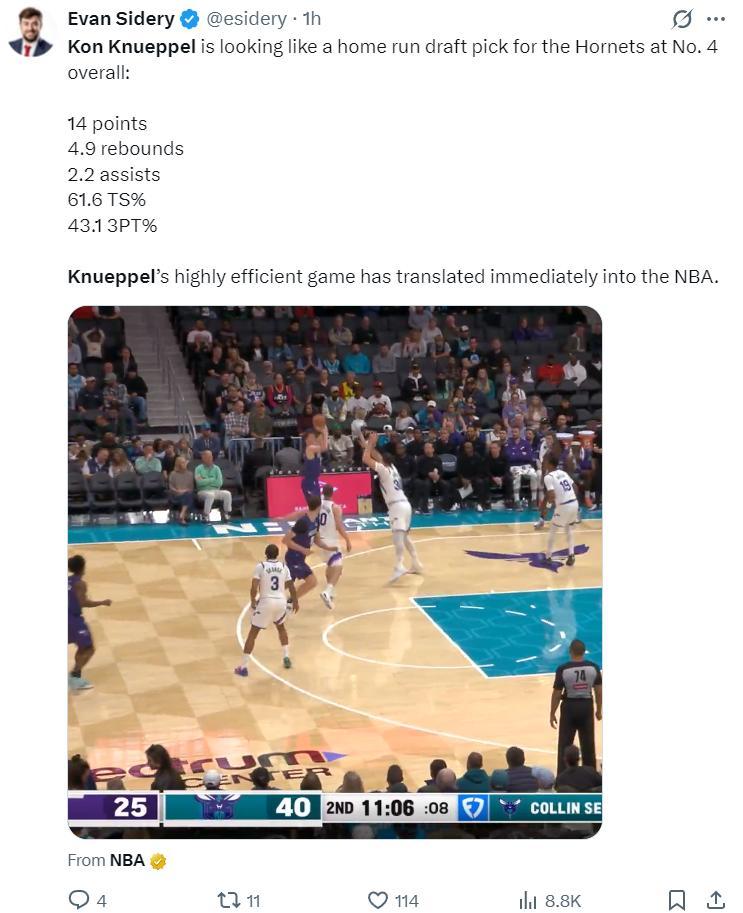 今夏黃蜂用四號籤選中克努佩爾時引發了巨大的爭議,因爲克努佩爾是一個純投手,防守不佳、持球能力不足、身體對抗不行、尺寸也不足,但目前他在新秀榜上排名是第三的存在。