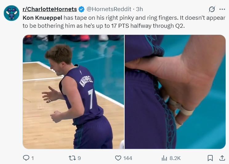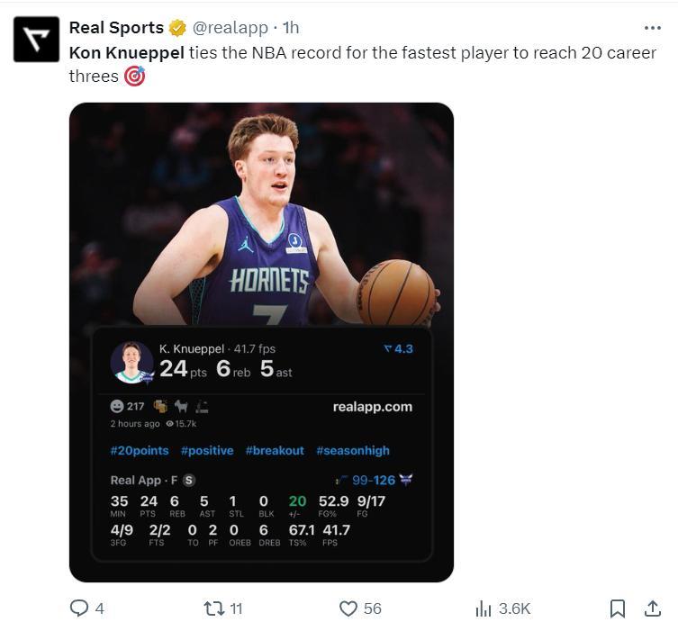 這場比賽後克努佩爾場均30.1分鐘,拿到14分4.9籃板2.2助攻,真實命中率61.6%,三分命中率43.1%,他的表現越來越出色,黃蜂這個4號籤並沒有水。