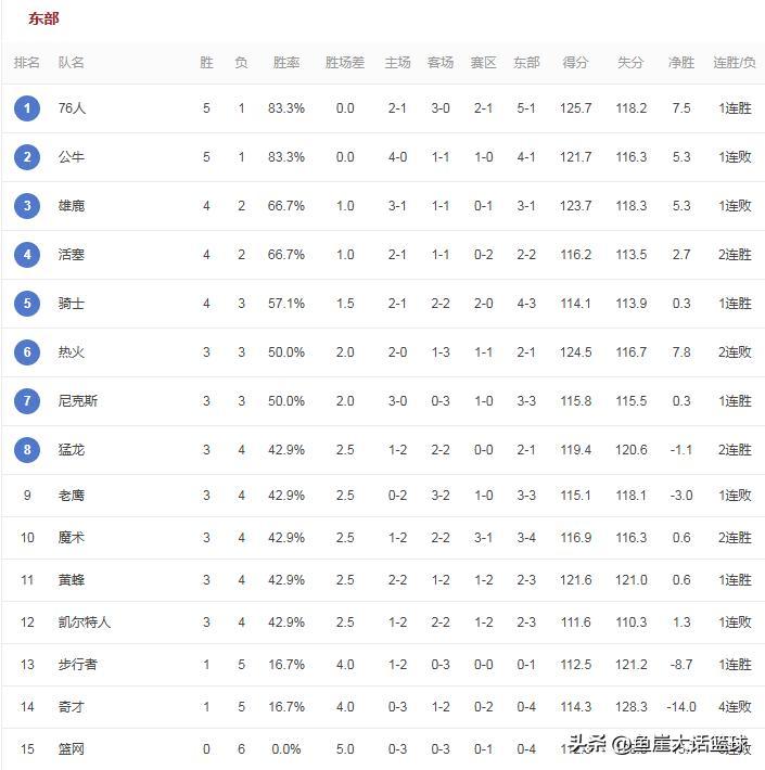 76人在今天的比賽中對陣籃網,這場比賽76人雖然是缺少了恩比德,但是馬克西在場上有着穩定的發揮不說,同時這場比賽中76人探花埃奇庫姆和格萊姆斯也有着不錯的表現,加上烏佈雷也一度在比賽中打出爆發表現,因此這場比賽的懸念也沒有持續太久,最終76人大勝籃網。而在這場比賽後76人更是以5勝1負的戰績升到了東部第一的位置,籃網則遭遇6連敗排在東部倒數第一的位置,同時籃網也是東部這邊唯一 一支未嘗一勝的球隊。同時在今天的比賽中老鷹對陣騎士,本場比賽騎士雖然一度拉開比分,但是老鷹打得堅韌追上比分,但最終在米切爾帶領下,騎士還是有驚無險的贏下比賽勝利。