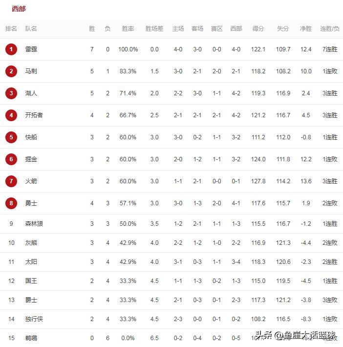 北京時間11月3日NBA進行了8場常規賽,這些比賽完畢之後NBA最新排名正式出爐。雷霆在今天的比賽中對陣鵜鶘,這場比賽也是沒有太多的懸念,畢竟鵜鶘在本賽季的表現太過糟糕,而這場比賽亞歷山大早早找到進攻狀態,加上維金斯等人也在比賽中有着優異的表現,所以雷霆很快就拉開比分,最終雷霆大勝鵜鶘。這場比賽後雷霆豪取7連勝排在西部第一的位置,反觀鵜鶘慘遭6連敗排在西部倒數第一的位置,而且鵜鶘也成爲西部唯一 一支未嘗一勝的球隊。