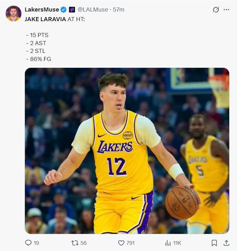 這場比賽是湖人背靠背的第一場,今夜打了熱火,明晚又要打開拓者,所以雷迪克擴大了輪換布朗尼得到了一些時間,不過還是一套主力9人輪換而已,替補席上拿600萬的拉拉維亞就是尖刀,在東契奇、裏夫斯手感都不佳的情況下他成爲第三巨頭,首節2中2+三分1中1拿到6分1搶斷。