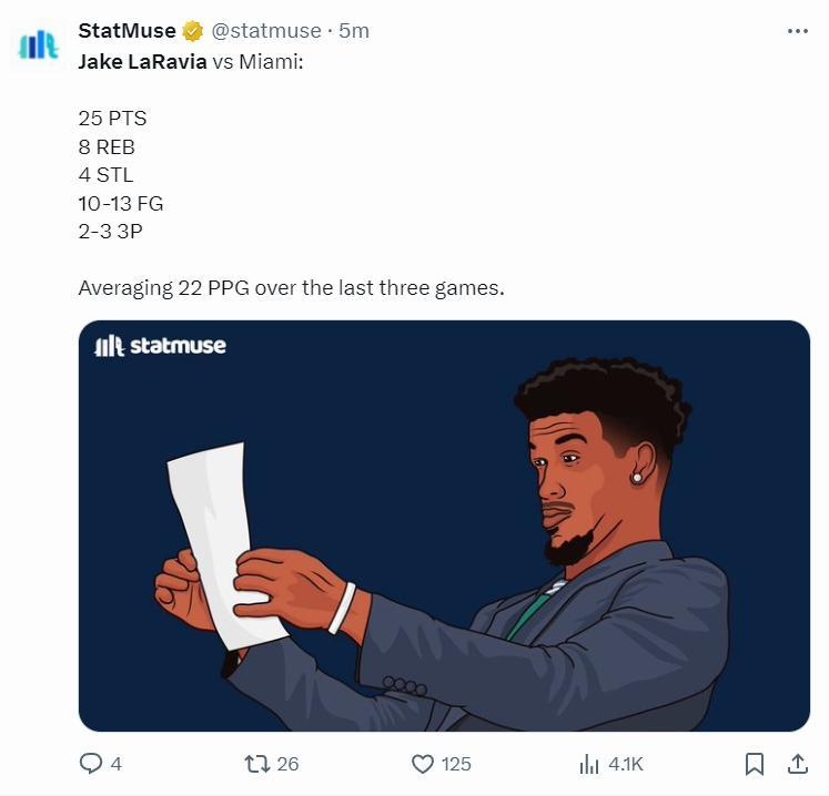 4天之前,拉拉維亞11中10+三分6中5拿到27分8籃板2助攻1搶斷1蓋帽,此役拉拉維亞35分鐘,13中10+三分3中2,拿到25分8籃板3助攻4搶斷,命中率76.9%,三分命中率66.7%,他險些又完成一場生涯之夜。