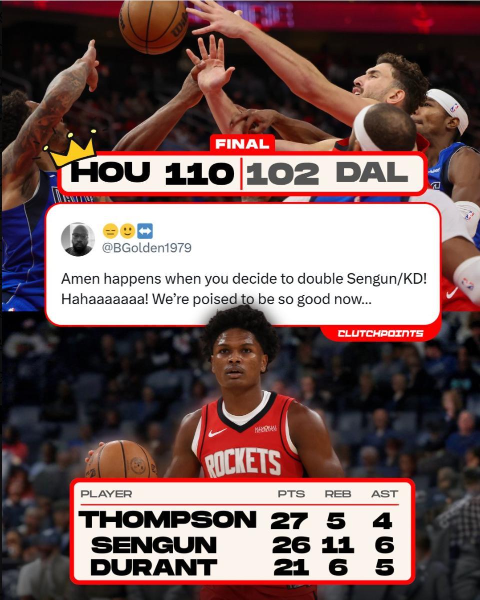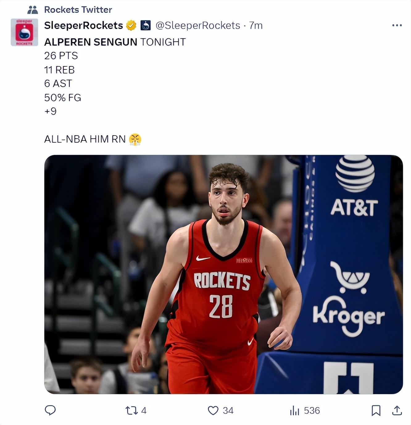 北京時間11月4日,火箭以110-102擊敗獨行俠拿到四連勝。杜蘭特此役的手感很差、特別差,在末節他命中了兩個關鍵三分,可決勝時刻他被獨行俠嚴防死守,好在沒有死神還有申神,他要了一個1-4拉開單打加福德,隨後申京完成制勝一擊,獨行俠暫停後申京下場休息大口喘氣。