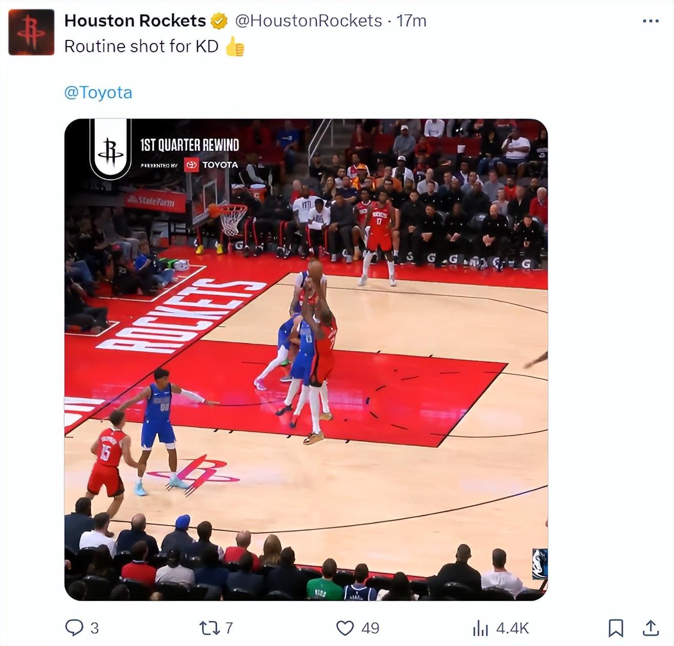 這場比賽開場杜蘭特的手感沒有那麼爆炸,但這個急停的後仰跳投還是非常華麗的,火箭官方也發佈了視頻,單節7中3+三分2中0,拿到8分1籃板0助攻,表現中規中矩。