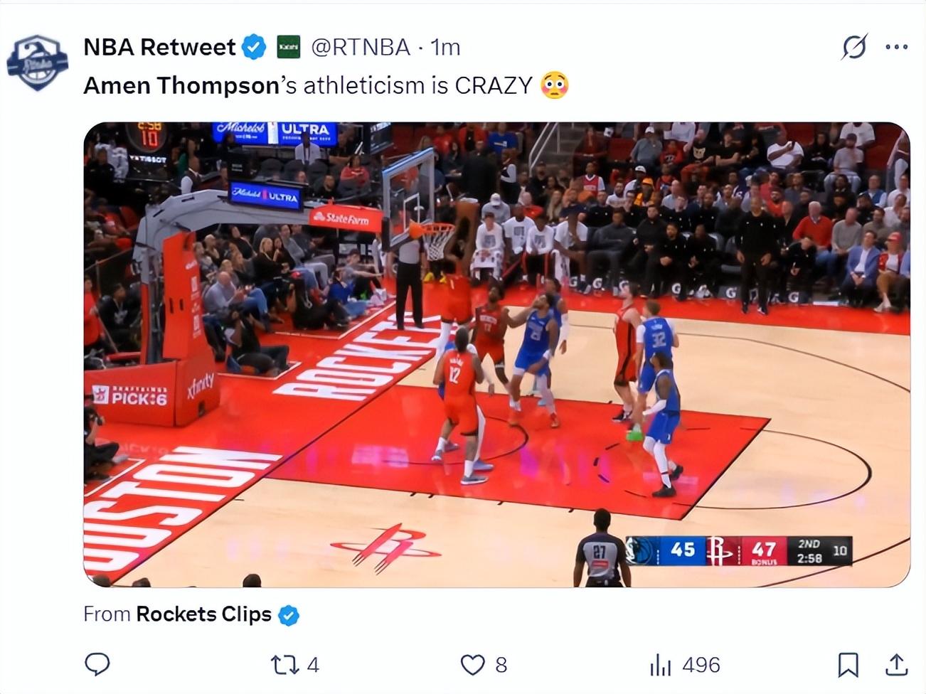 阿門這個背扣實在是太精彩了,他第二罰沒進,然後自己搶下了前場籃板,還是一個邊線的救球,隨後他傳給罰球線位置的申京,申京吸引了兩個人的包夾,直接空接助攻阿門,阿門高高躍起背扣成功。美媒NBA Retweet:阿門這太瘋狂了。