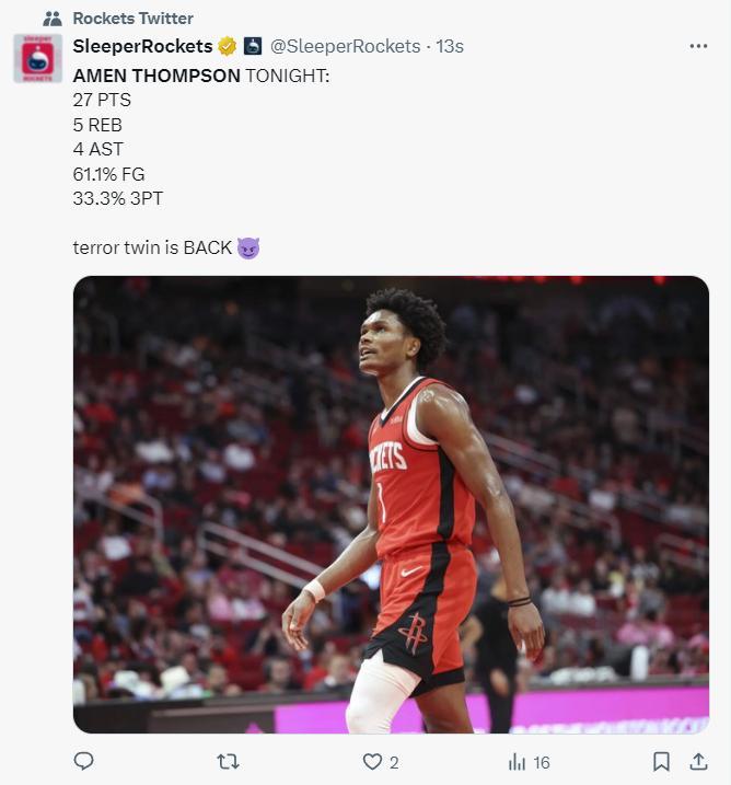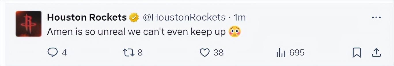 火箭官方:阿門這太不真實了,我甚至跟不上他。(半場打完阿門已經20分4籃板4助攻1搶斷,火箭得分最高的)
