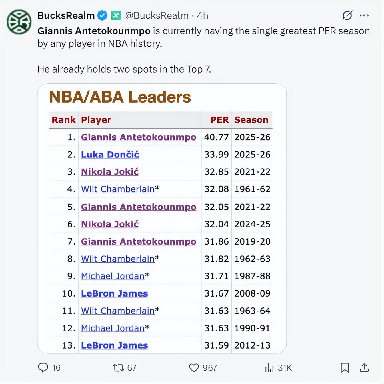 揚尼斯本賽季的PER值高達40.77排在聯盟第一,東契奇33.99排在第二,揚尼斯這是斷崖第一。