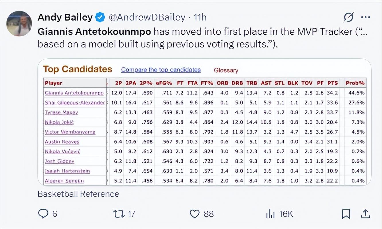除此之外,在數據網站BBR上,揚尼斯的MVP概率高居44.6%排在聯盟第一,SGA、馬克西、約基奇、文班亞馬都在揚尼斯之後。