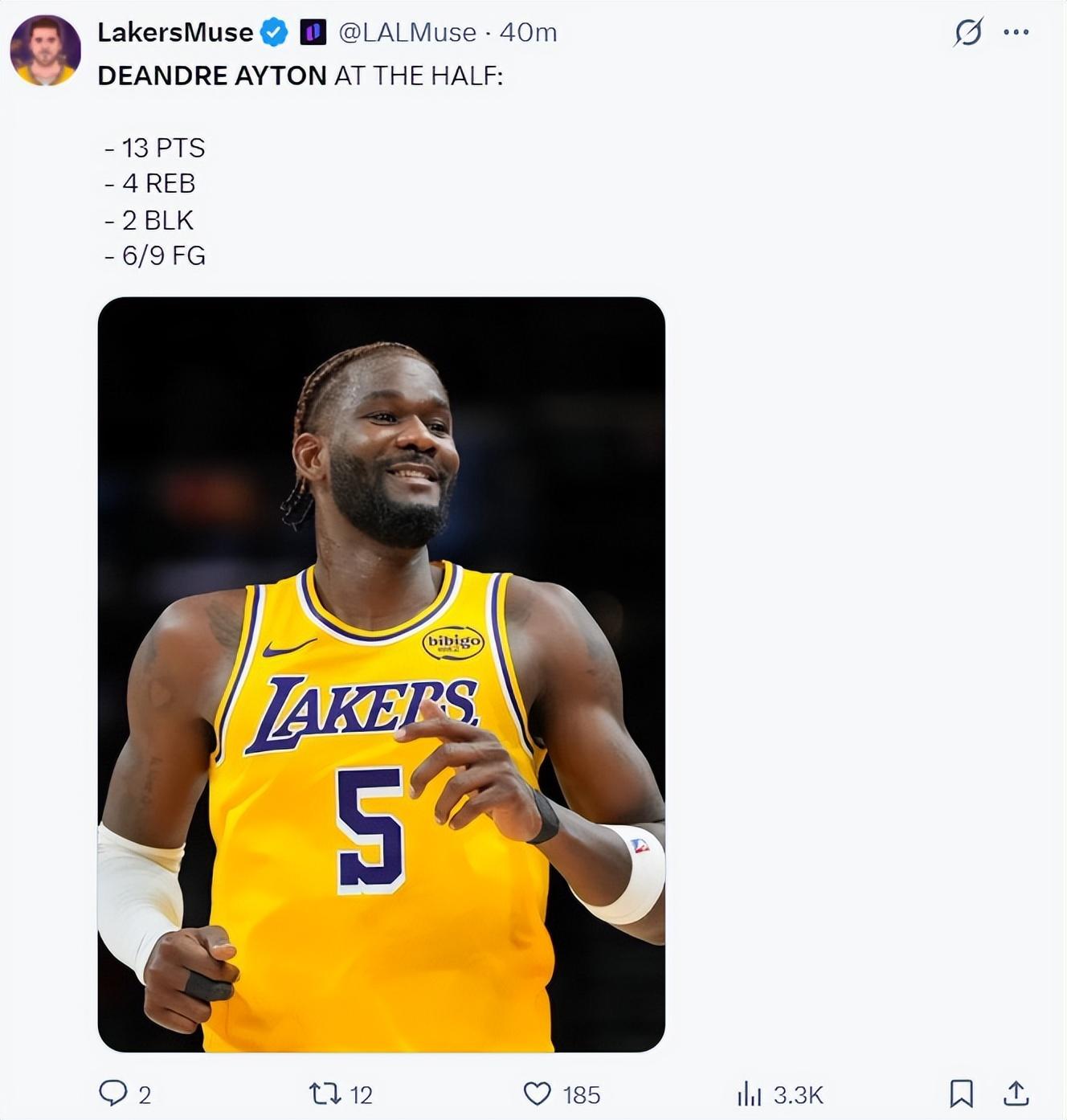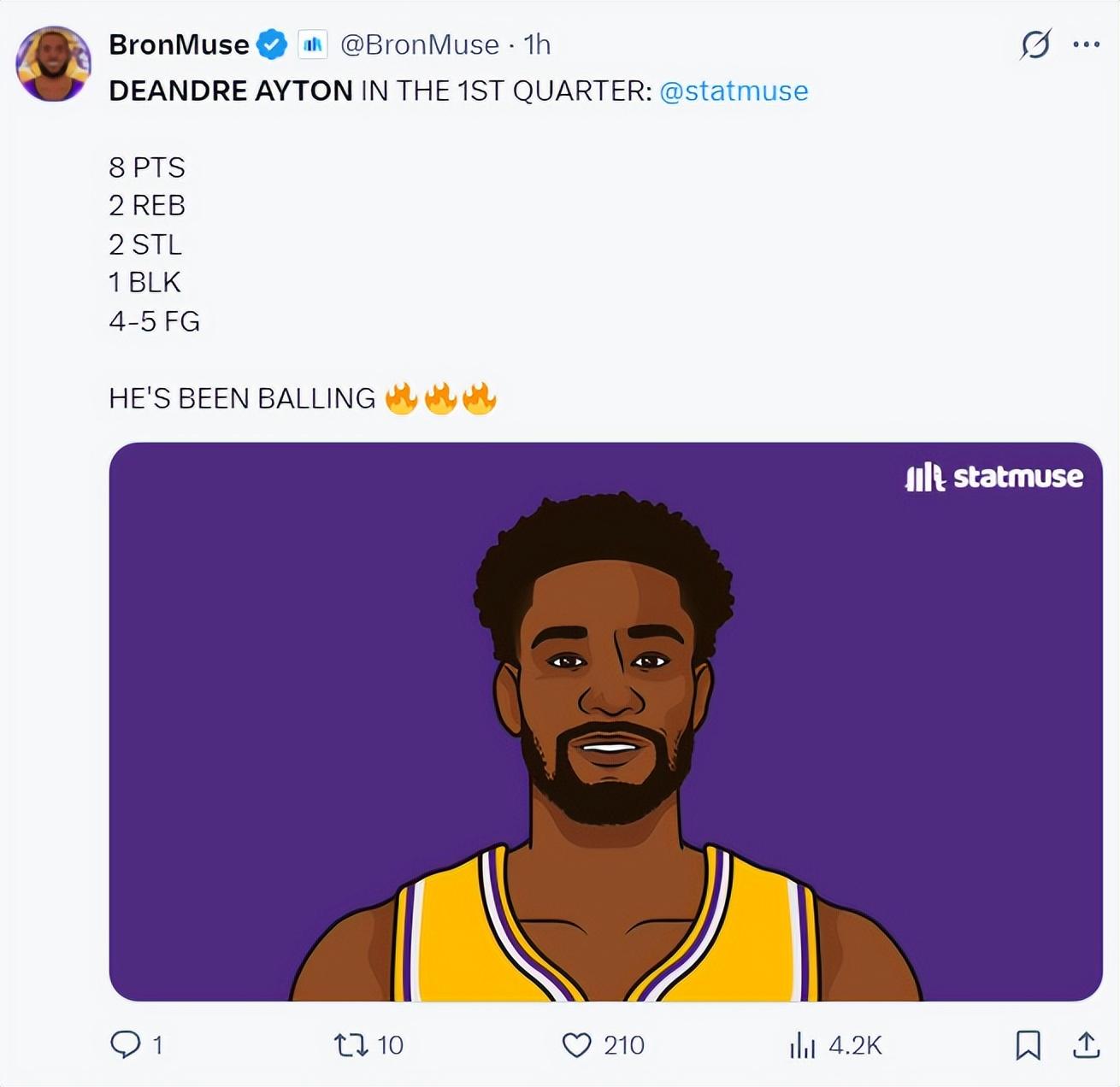 第三節湖人媒體:每當艾頓出手時,我就覺得一定會進,因爲他此役太出色了。艾頓單節6中4拿到8分3籃板,三節15中10拿到21分7籃板1助攻2蓋帽,命中率高達66.7%,他背靠背第一場輪休這一場體能真的很充沛。