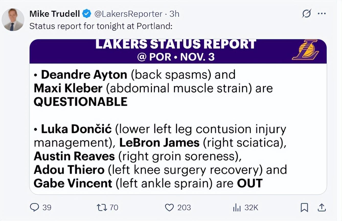 北京時間11月4日,湖人背靠背第二場東契奇、裏夫斯均因傷缺席,開拓者這邊召回了楊瀚森,但楊瀚森此役繼續被整場DNP,開拓者在主場一度領先13分,湖人在第三節打完後反超,最終殘陣湖人三人20+以123-115擊敗開拓者拿到四連勝。