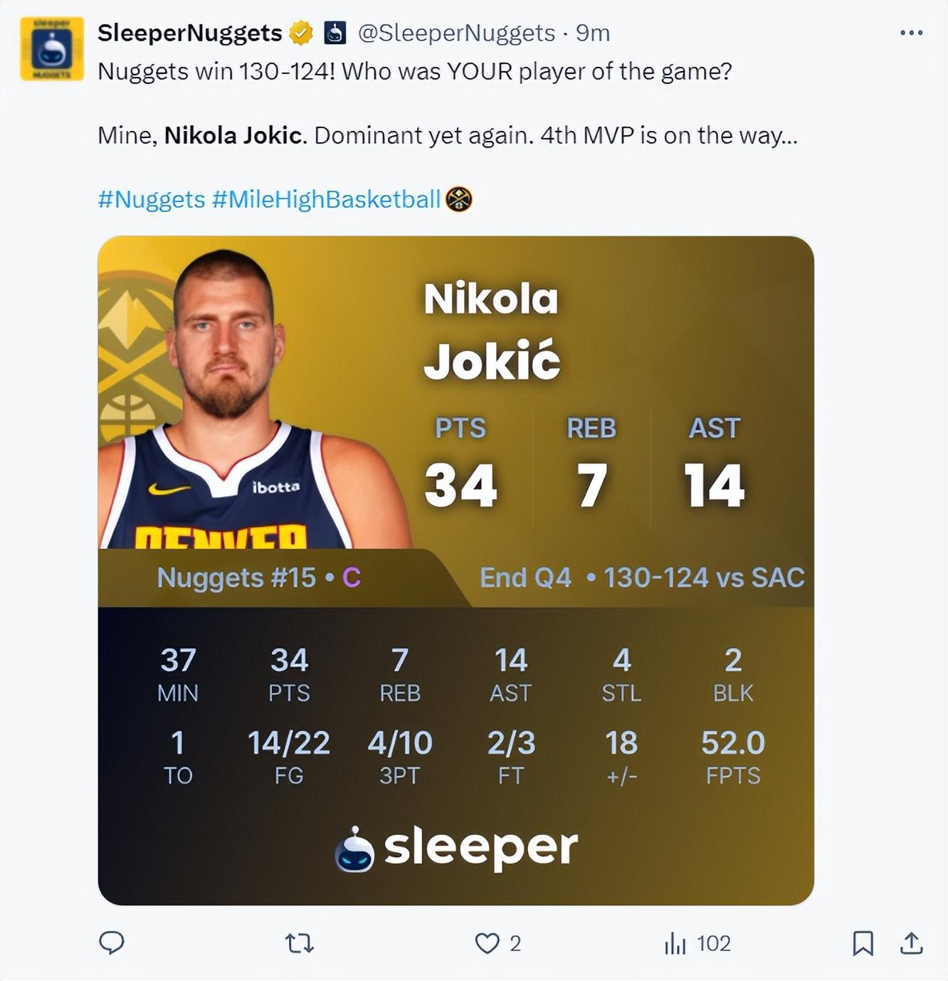 全場比賽約基奇36分鐘,22中14,三分10中4,罰球3中2,拿到34分14助攻7籃板4搶斷2蓋帽,命中率63.6%,真實命中率高達80.4%,正負值+18。