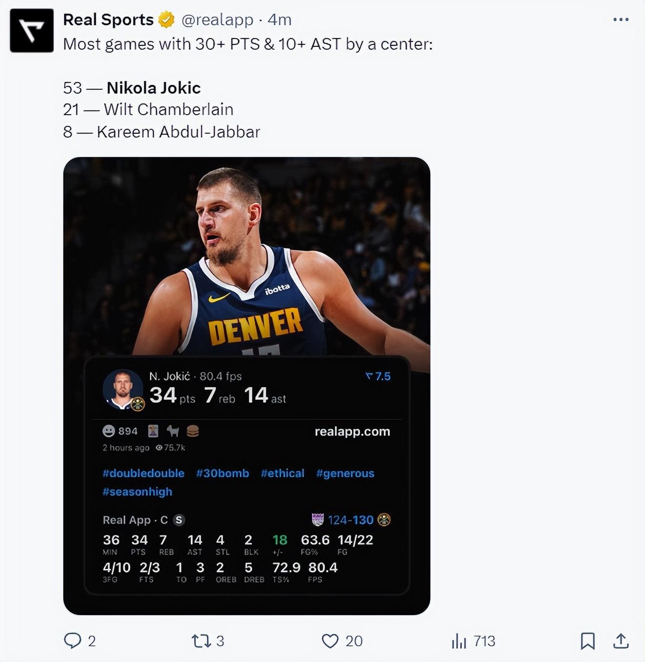 此役後約基奇拿到第53次30分+10助攻,排在第二的中鋒張伯倫只有21次,約基奇繼續刷新歷史第一中鋒紀錄。