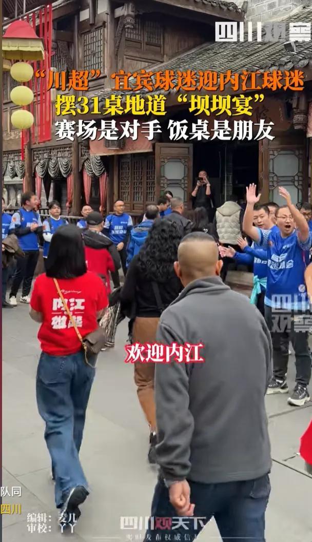 比如宜賓球迷擺了31桌地道的壩壩宴歡迎內江球迷。打出的口號是:賽場是對手,飯桌是朋友。