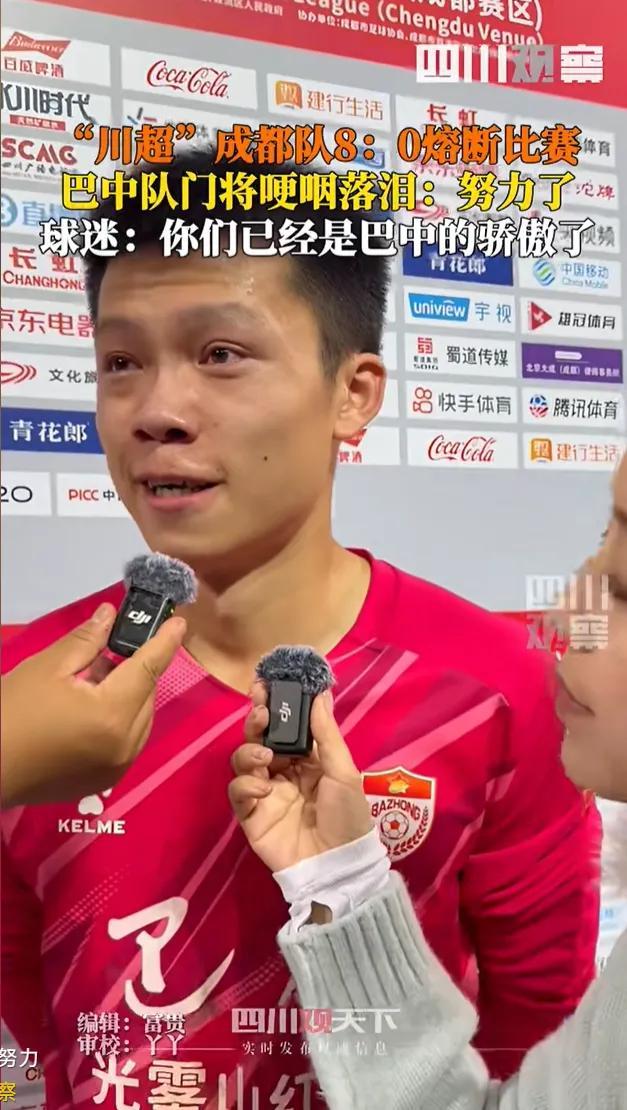 11月8日,巴中0-8大比分輸給成都。巴中門將在賽後採訪時哽咽落淚,旁邊傳來了球迷暖心的鼓勵:你們已經是巴中的驕傲了!