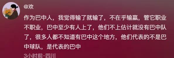 還有巴中球迷留言:作爲巴中人,我覺得輸了就輸了,不在乎輸贏,管它職業不職業,巴中至少有人上了,他們不上估計就沒有巴中隊了,很多人都不知道有巴中這個地方,他們代表的不是巴中球隊,是代表的巴中。