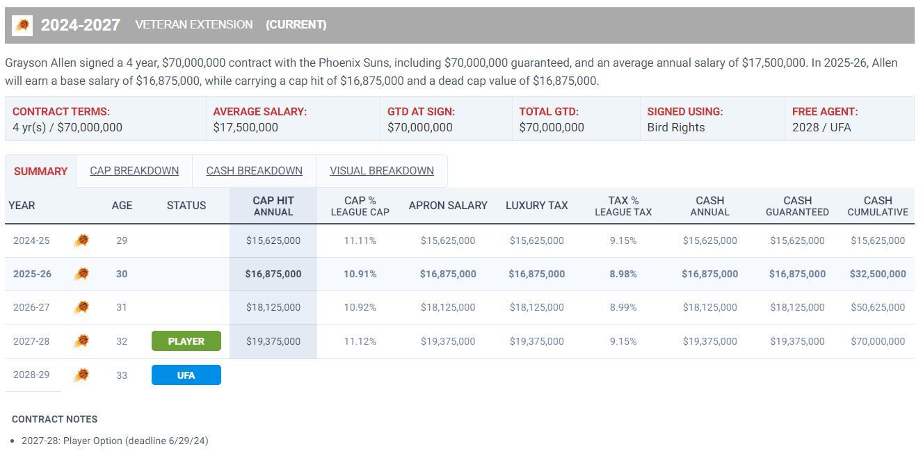 阿倫這份合同,27-18賽季是球員選項,他的均薪只有1750萬,說實話真的不貴,這個級別的投手還有防守,很多季後賽球隊都需要。