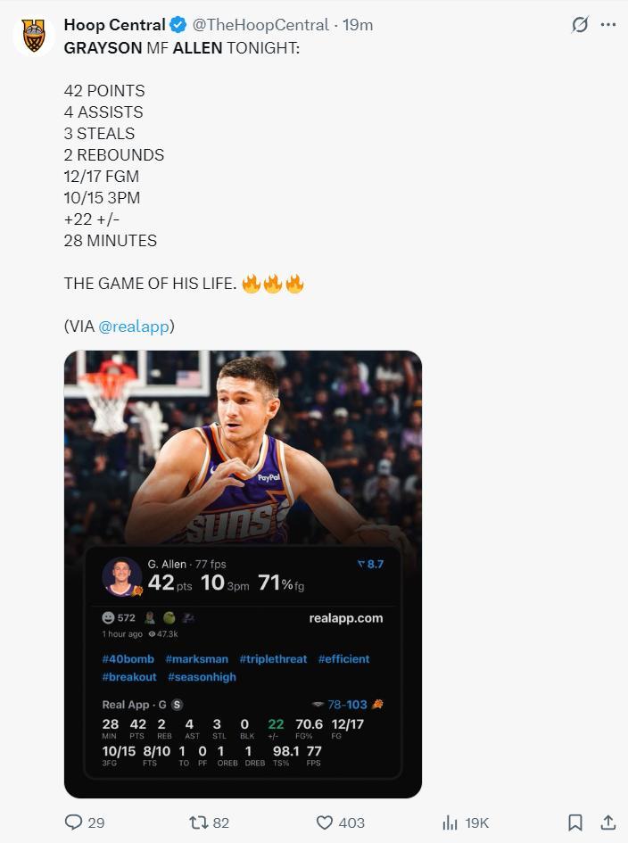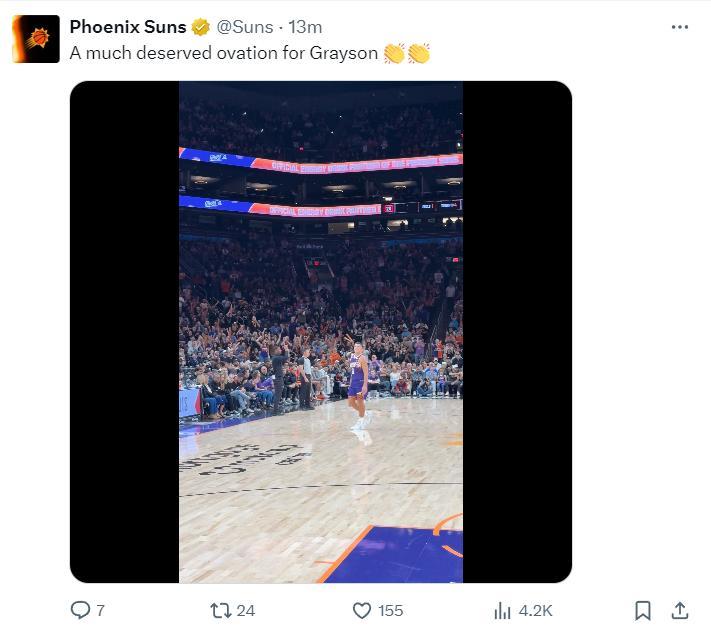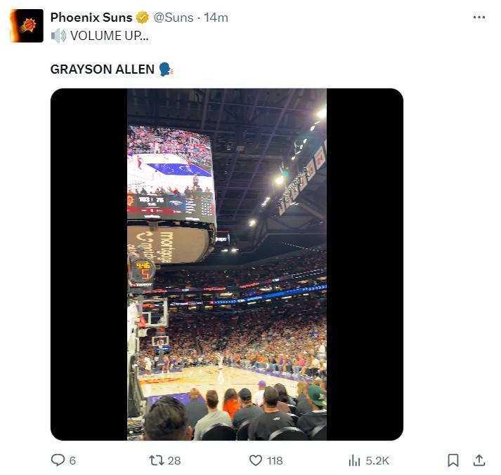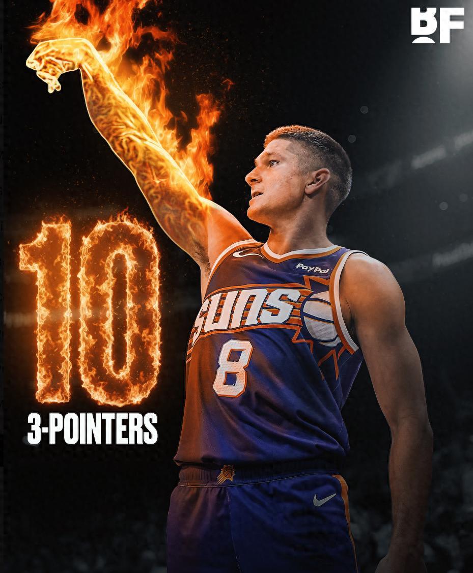 太陽官方這場比賽成爲阿倫第一粉頭,我數了一下關於阿倫的推文30分鐘內有7條,因爲阿倫在不斷逼近隊史單場9個三分紀錄與阿倫生涯最高分(40分)。