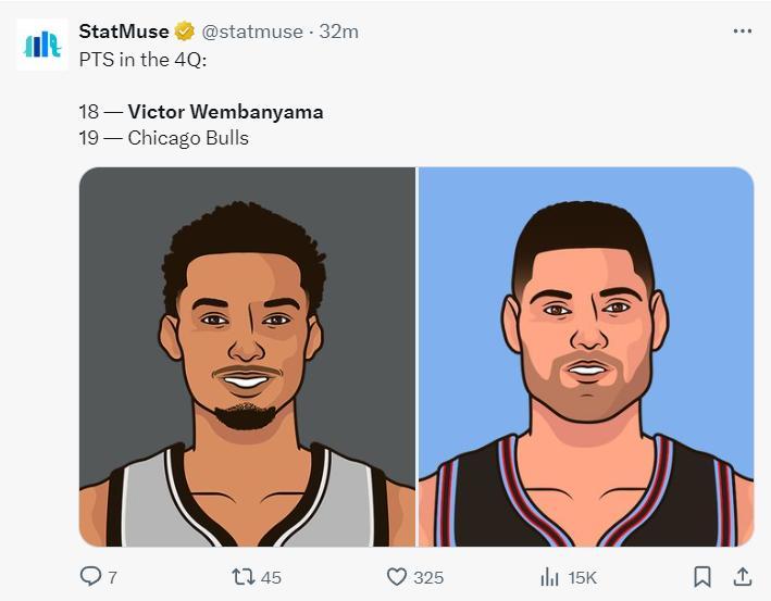 文班亞馬在末節8中6+三分3中3,拿到18分5籃板,他帶領馬刺打出32-19的攻防浪潮,公牛全隊末節只有19分,武切維奇沒有在內線進過球,這就是文班亞馬的統治力。