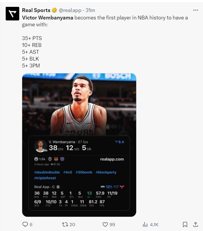 全場比賽文班亞馬36分鐘,19中11,三分9中6,罰球10中10,拿到38分12籃板5助攻1搶斷5蓋帽,命中率57.9%,三分命中率66.7%,真實命中率87%,正負值+13。