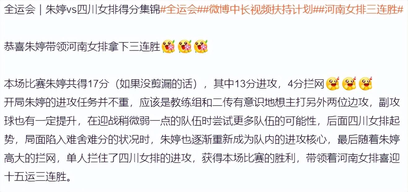 全運會三場比賽,河南3-0天津、河南3-1雲南,河南3-1四川,這一波三連勝後河南隊已經提前鎖定了一個八強席位,所以餘下面對澳門、北京、江蘇的比賽朱婷可以適當的輪休,尤其是對陣澳門一戰會是小組賽最輕鬆的一戰,不少媒體人都建議31歲的朱婷直接輪休一分鐘不打都行。