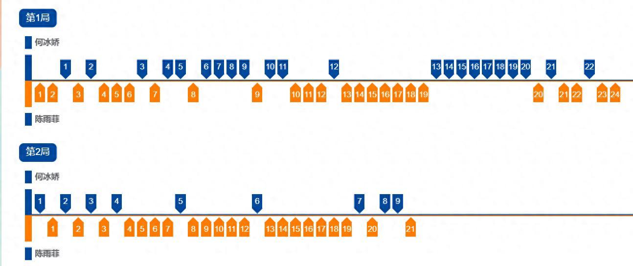 這場比賽淡出國家隊一年的何冰嬌真的拼光最後一顆子彈,第一局她在3-7落後、12-19落後,兩次大比分落後的情況下都沒有放棄,第一次追到9-9、10-10,第二次追到20-20、21-21、22-22,何冰嬌已經打得非常出色了,奈何雨菲大帝要稍勝一籌。