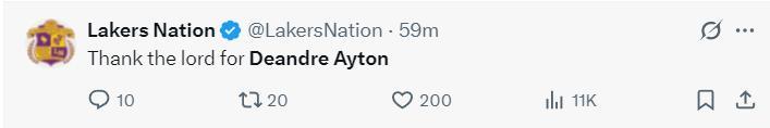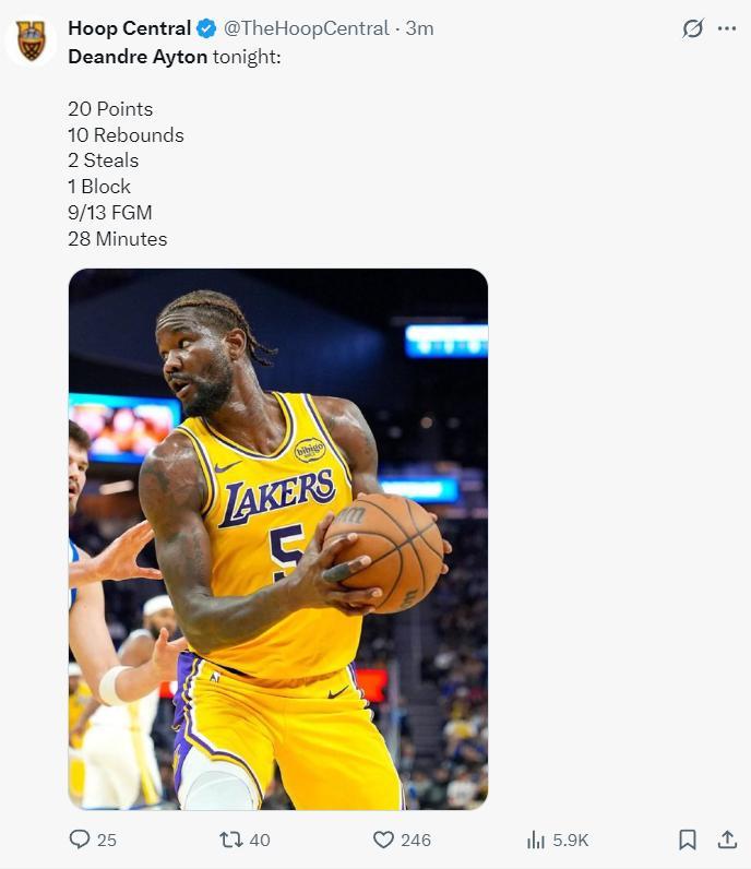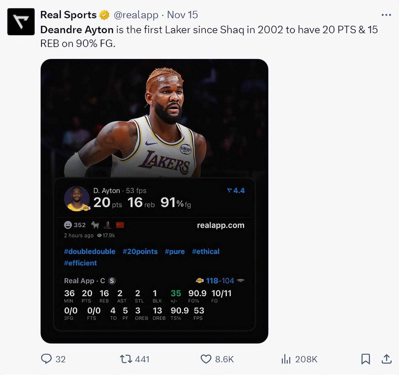 對陣鵜鶘的背靠背G1,艾頓36分鐘,11中10拿到20分16籃板2助攻2搶斷1蓋帽,真實命中率90.9%,他成爲2002年奧尼爾後首位命中率超過九成拿到20+15的球員。