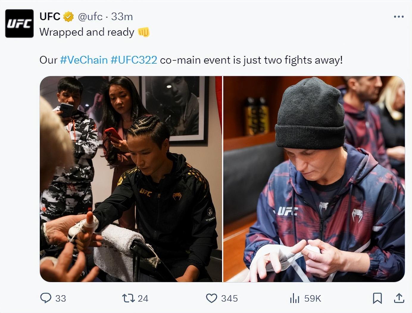 張偉麗與子彈姐進行了綁手後換上比賽服都進入了八角籠。
