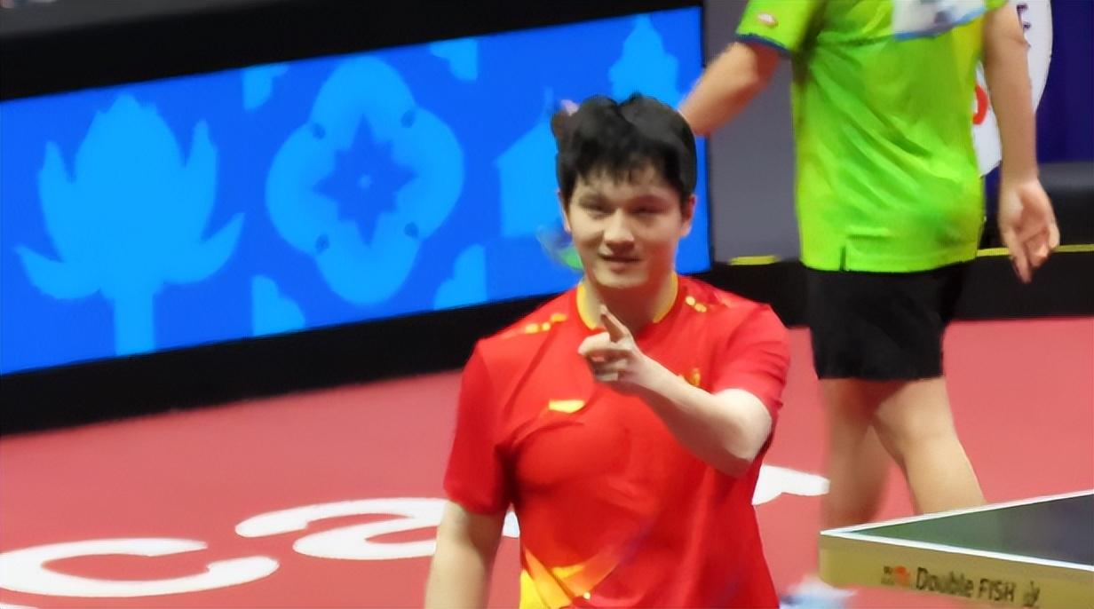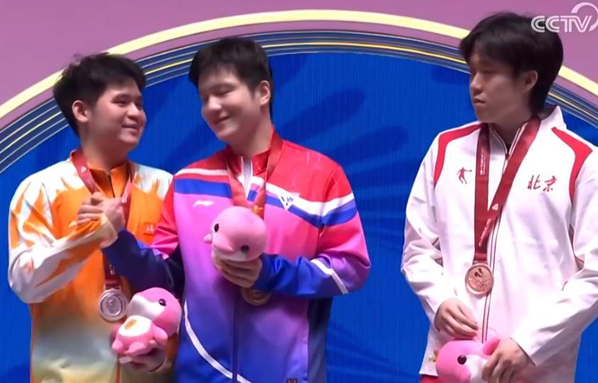 王楚欽雖然只拿到銅牌,但心情好像挺不錯,主持人在介紹大頭是第三名時,王楚欽露出了燦爛的笑容。