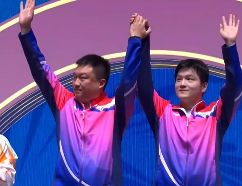 樊振東上臺之前圍繞領獎臺走了一圈,與北京隊、海南隊都球員、教練員都進行了握手致意才登場,小胖也微笑揮手感謝球迷。