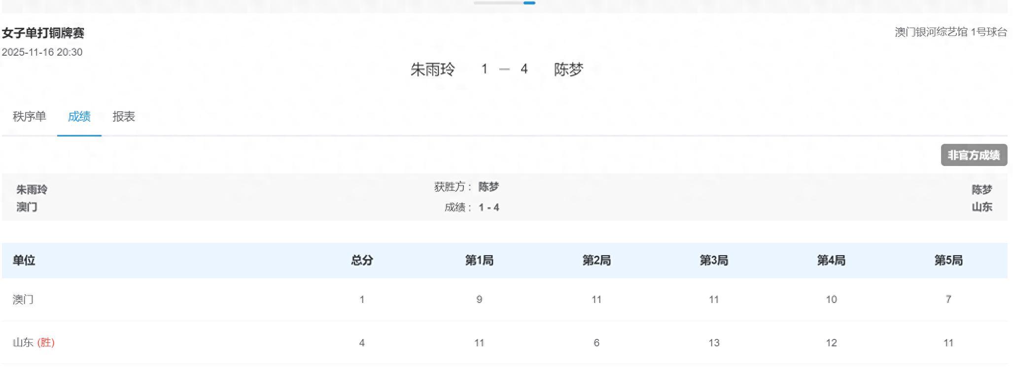 北京時間11月16日,全運會女單成年組銅牌戰,陳夢以4-1擊敗朱雨玲,五局比分:11-9、6-11、13-11、12-10、11-7。陳夢拿到自己全運會首枚銅牌,目前是1金3銀1銅,陳夢此前採訪說過贏1分是一分,走到哪裏都接受結果,心態很好。