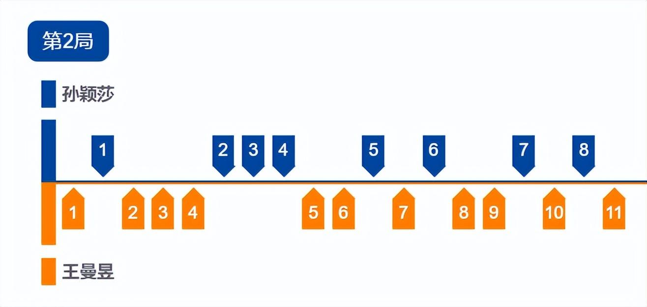 第二局王曼昱4-1領先,孫穎莎追到4-4,王曼昱6-4再度領先,隨後7-5、9-5,10-7拿到局點,第二局王曼昱11-8扳平大比分。