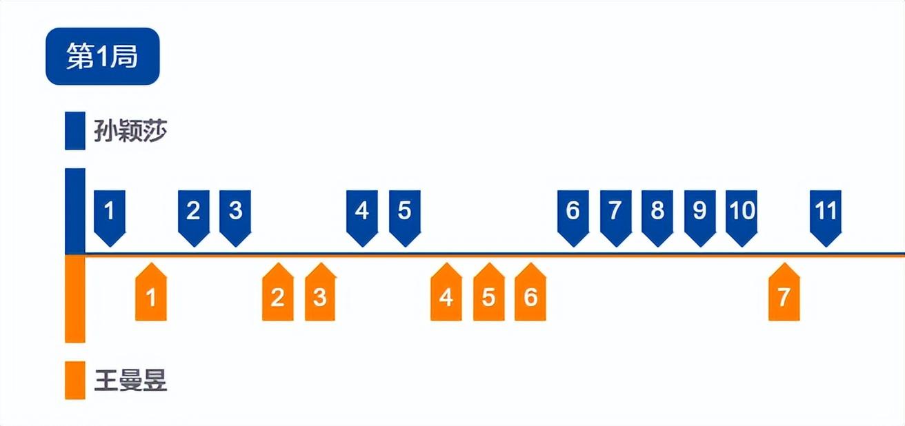 第一局孫穎莎進入狀態很快,3-1領先,5-3領先,王曼昱6-5反超後孫穎莎連拿5分直接拿到局點,孫穎莎11-7先下一城。