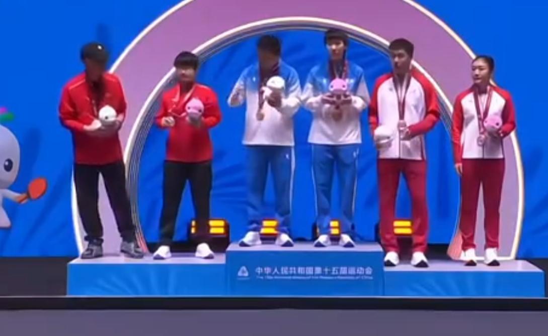 隨後舉行女單的頒獎儀式,教練員、球員都紛紛登上領獎臺,黑龍江隊的王曼昱、張海峯C位,河北隊的孫穎莎、楊廣弟右側,山東隊的陳夢、吳顥左側。