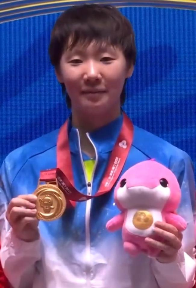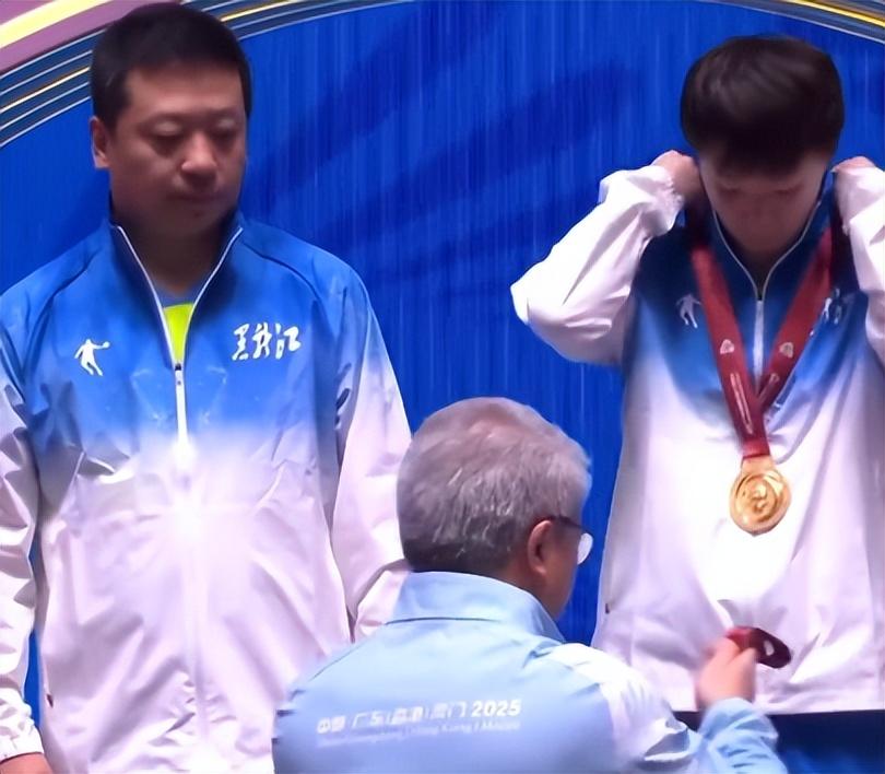 發獎牌時吳海峯指導的眼神就出賣了他,他對這塊金牌太憧憬了,他肯定很希望王曼昱能衛冕成功,沒想到王曼昱真的做到了。